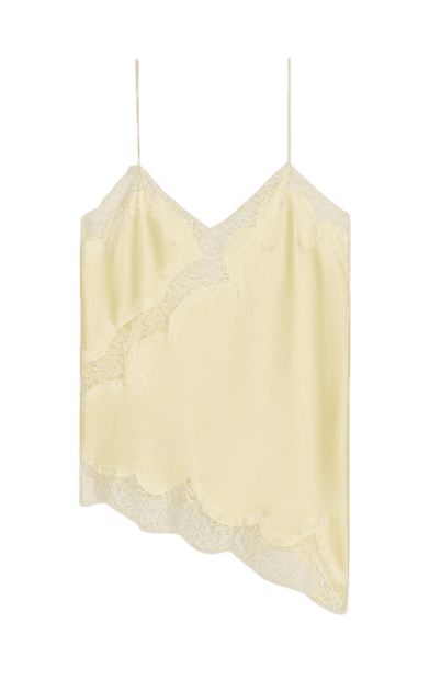 Este look exala leveza e sofisticação, perfeito para os dias ensolarados. A camisole em tom amarelo claro com detalhes em renda branca harmoniza com a saia longa fluida em off-white, criando uma silhueta elegante e confortável. Os acessórios, como a sandália rasteira em caramelo, a bolsa de palha com alça dourada, o relógio e os óculos de sol, adicionam um toque de glamour e praticidade. É a escolha ideal para um almoço de verão, um passeio à beira-mar ou um encontro casual chic, garantindo estilo e frescor em qualquer ocasião diurna.