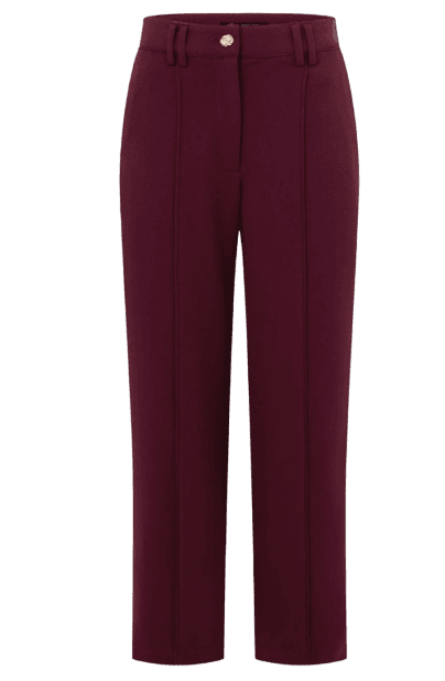 Este look exala sofisticação casual, combinando a elegância descontraída de uma polo verde escura com a riqueza da calça marsala de corte reto. A paleta de cores, inspirada em tons terrosos e joias, cria uma harmonia visual perfeita para diversas ocasiões. Os mocassins marsala com detalhe dourado e a bolsa com alça trançada adicionam textura e um toque artesanal. Acessórios dourados, como o colar de elos robustos, brincos e relógio, elevam o conjunto, enquanto o cinto preto marca a cintura com discrição. É a escolha ideal para a mulher que busca um visual polido e confortável para o trabalho, reuniões ou um happy hour elegante.