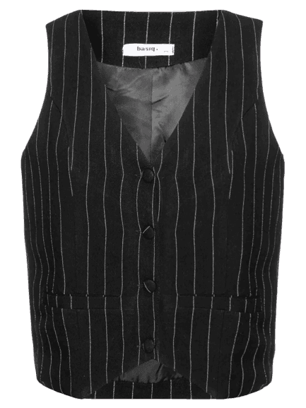 Este look exala uma sofisticação moderna, combinando a elegância clássica do colete risca de giz com a ousadia contemporânea da saia midi de couro. A silhueta alongada da saia, com seu brilho sutil, contrasta lindamente com a textura da alfaiataria do colete, criando um visual equilibrado e impactante. Os acessórios dourados, presentes nos brincos, na fivela do scarpin slingback e no detalhe da bolsa matelassê, adicionam pontos de luz e um toque de luxo. Perfeito para a mulher que busca um estilo marcante e versátil, transitando com confiança do ambiente de trabalho a eventos noturnos.