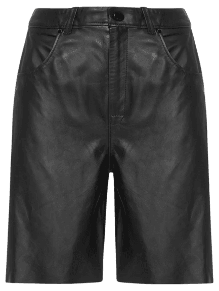 Para um ambiente de trabalho mais casual, você pode manter a bermuda de couro e a regata, adicionando um blazer estruturado e trocando a sapatilha por um scarpin ou mocassim mais formal, mantendo a bolsa e os brincos para um toque moderno.