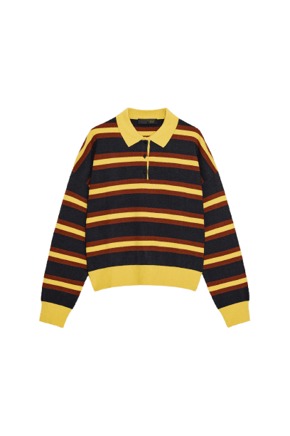 Este look exala uma elegância descontraída, combinando peças clássicas com toques modernos. O suéter listrado em tons de azul marinho, amarelo e marrom, com sua gola polo, oferece um ar sofisticado e confortável. A pantacourt jeans escura traz um toque contemporâneo e versátil, ideal para diversas silhuetas. Os acessórios são o ponto alto: um scarpin dourado de bico fino que alonga a silhueta, uma bolsa box azul marinho com textura de cobra e alça dourada, e brincos pendentes que adicionam brilho. Perfeito para transitar do trabalho casual para um happy hour com estilo.