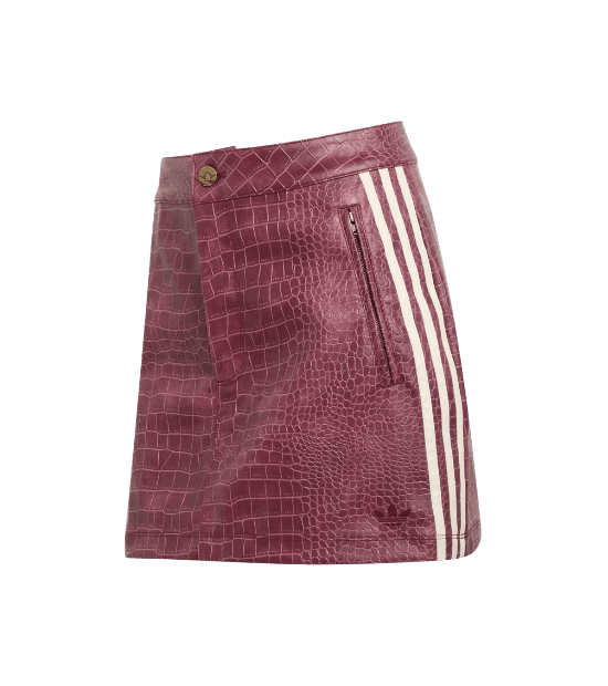 Este look exala um estilo esportivo chic e contemporâneo, perfeito para quem busca conforto sem abrir mão da elegância. A jaqueta bomber e a minissaia, ambas em um sofisticado tom de borgonha com textura croco e as icônicas listras brancas, criam um conjunto harmonioso e cheio de personalidade. O top cropped preto adiciona um toque moderno e despojado, enquanto os tênis em rosa malva oferecem um contraste suave e garantem o conforto para o dia a dia. A bolsa de mão preta, com seu design único, finaliza o visual com um toque de sofisticação urbana. Ideal para explorar a cidade ou um encontro casual.