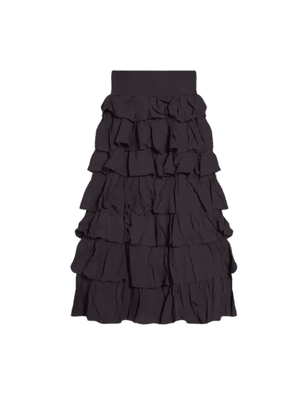 Este look exala uma elegância contemporânea, combinando peças clássicas com um toque moderno. A saia midi preta de babados em camadas oferece movimento e um charme romântico, enquanto a blusa de poá, com seu design bufante e gola alta, adiciona um ar divertido e sofisticado. A bota slouchy marrom-acinzentada traz uma textura suave e um toque descontraído, equilibrando a formalidade. Os acessórios dourados, como a mini bolsa e os brincos, injetam um brilho luxuoso, elevando o conjunto para diversas ocasiões, do happy hour ao jantar especial.