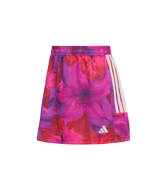 Este look feminino exala energia e estilo com sua vibrante estampa floral. A combinação da jaqueta corta-vento e saia, ambas com um padrão de flores em tons de fúcsia e roxo, cria um conjunto harmonioso e chamativo. A camiseta cropped bege com o logo discreto equilibra a intensidade das cores. Para completar, o boné rosa adiciona um toque divertido, enquanto os tênis plataforma em marrom e rosa oferecem conforto e um toque moderno. Ideal para quem busca um visual casual, despojado e cheio de personalidade para o dia a dia ou eventos descontraídos.