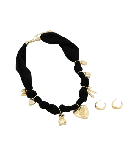O look já vem com acessórios que harmonizam perfeitamente: um colar de fita com pingentes dourados e brincos de argola. Uma bolsa baguete marrom com detalhes em fivela complementa o visual, adicionando um toque de sofisticação casual.