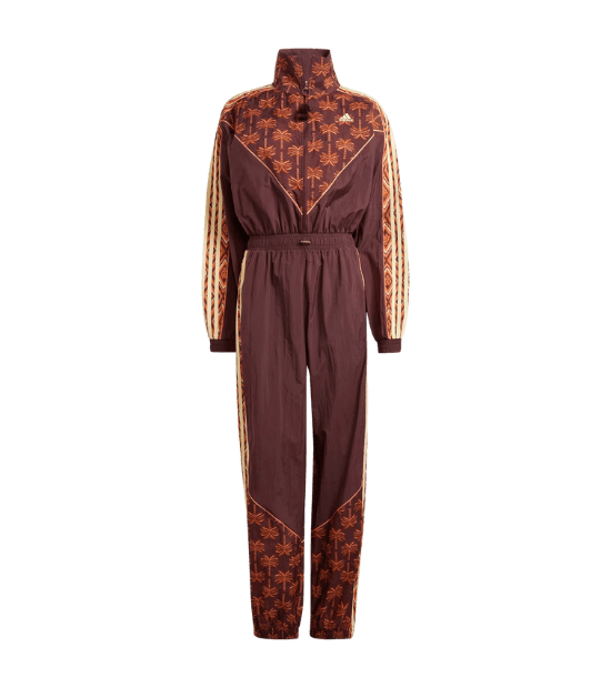 Este look exala uma vibe esportiva e moderna, perfeita para quem busca conforto sem abrir mão do estilo. O macacão em tom terroso com estampa geométrica e listras laterais é a peça central, oferecendo um caimento relaxado e cheio de personalidade. O top cropped off-white com zíper adiciona uma camada extra de estilo e versatilidade. Complementado por tênis casuais brancos com detalhes em bege e uma bolsa transversal prática, este conjunto é ideal para o dia a dia, passeios urbanos ou viagens, garantindo um visual despojado e autêntico.