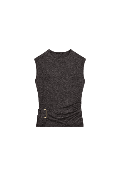 Este look exala uma elegância casual chic, perfeito para a mulher moderna que busca sofisticação e conforto. A blusa sem manga em tom cinza chumbo, com seu detalhe drapeado e fivela discreta, harmoniza perfeitamente com a calça jogger de cintura alta em xadrez bege e marrom, que traz um toque de tendência. Os acessórios dourados, como o scarpin de bico fino e as pulseiras, adicionam um brilho luxuoso, enquanto a bolsa de mão bordô com alça diferenciada arremata o visual com um ponto de cor vibrante e refinado. Ideal para transitar do ambiente de trabalho para um happy hour ou jantar especial.