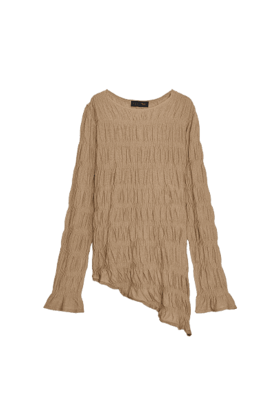 Com um suéter texturizado, acessórios discretos e elegantes são a melhor escolha. Brincos de elos dourados, como os do look, são perfeitos. Um colar delicado ou pulseiras finas também podem complementar sem sobrecarregar o visual.