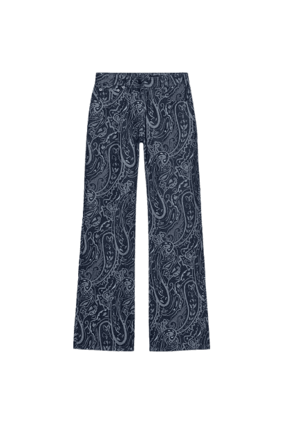 Para um clima mais quente, você pode substituir o cardigã por uma blusa de seda azul ou branca e optar por sandálias de salto baixo no lugar do scarpin, mantendo a calça estampada como peça central.