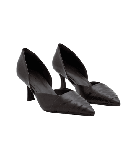 Este look exala sofisticação e modernidade, combinando peças clássicas com toques contemporâneos. A blusa preta de laço, com sua transparência sutil e detalhes em renda, confere elegância e um ar romântico. A calça jeans wide leg de cintura alta, com suas costuras frontais, traz um toque de tendência e conforto, equilibrando a formalidade da blusa. O scarpin d'Orsay de bico fino alonga a silhueta, enquanto os brincos delicados adicionam um brilho discreto. É a escolha perfeita para quem busca um visual versátil que transita com facilidade do ambiente de trabalho casual chic para um happy hour ou jantar especial.