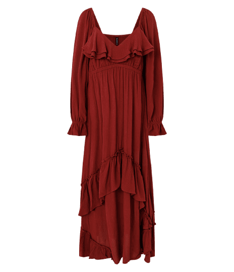 Este look exala um charme descontraído e elegante, perfeito para quem busca conforto sem abrir mão do estilo. O vestido longo em tom terracota, com seus delicados babados e caimento fluido, é a peça central, ideal para dias ensolarados ou temperaturas amenas. Acompanhando, a bolsa de mão em borgonha e as sandálias rasteiras com aplicações de pérolas adicionam um toque sofisticado e prático. A pulseira de pedras naturais arremata a produção com um toque boho chic, criando um visual harmonioso e cheio de personalidade para diversas ocasiões diurnas.