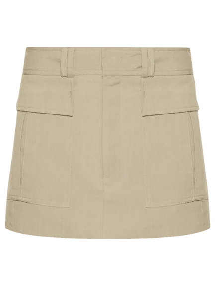 Este look exala uma sofisticação moderna, combinando peças clássicas com toques contemporâneos. O blazer risca de giz em cinza oferece uma estrutura elegante e profissional, enquanto a saia cargo bege adiciona um ar despojado e atual. A bolsa bucket em preto e branco com detalhes trançados e a sandália de salto alto com amarrações e bico dourado elevam a produção, conferindo um charme extra. É a escolha perfeita para a mulher que busca um visual versátil, transitando com facilidade do ambiente de trabalho para um happy hour ou um jantar especial, sempre com muito estilo.