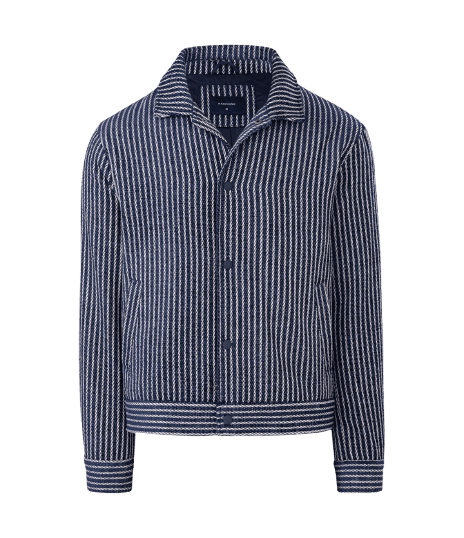 Este look masculino combina perfeitamente o conforto com a elegância casual, ideal para o homem moderno que busca versatilidade. A jaqueta bomber listrada em azul marinho e branco adiciona um toque de sofisticação e personalidade, enquanto a camisa polo preta oferece uma base clássica e atemporal. A calça chino azul marinho complementa o conjunto, proporcionando um caimento impecável. Os tênis esportivos pretos garantem o conforto necessário para o dia a dia, e os acessórios como o cinto trançado, o relógio de pulso e os óculos de sol elevam o estilo, tornando-o adequado para diversas ocasiões, do trabalho ao lazer.
