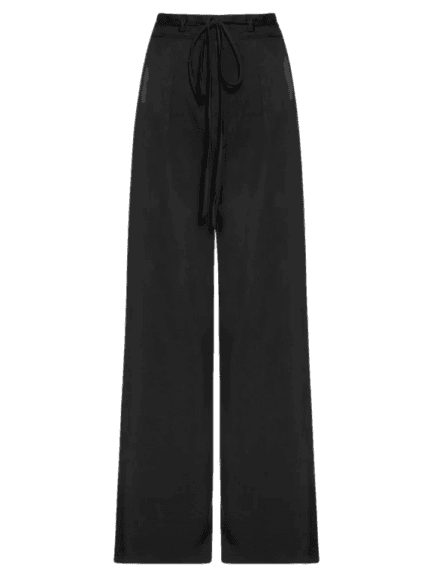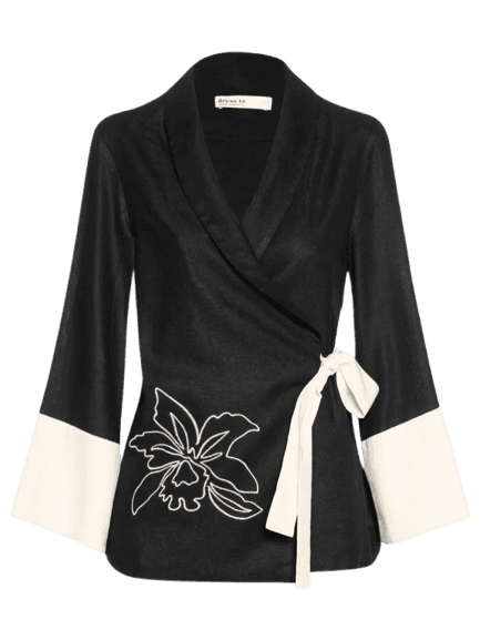 As peças-chave são a blusa transpassada com detalhes em creme e bordado de orquídea, a calça pantalona preta que proporciona fluidez, os mules de salto para um toque moderno e a bolsa matelassê com corrente.