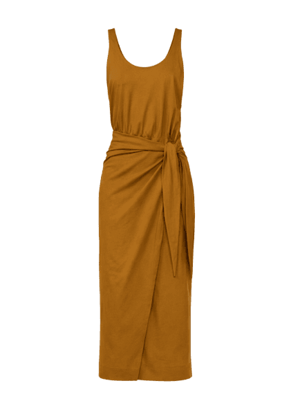 O vestido mostarda combina muito bem com acessórios em tons terrosos, dourados, bordô ou marrom, como visto neste look, realçando a paleta de cores e o estilo boho.
