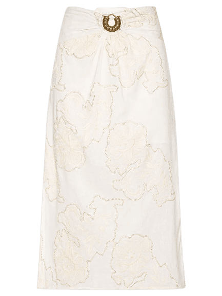 Este look exala uma elegância descontraída, perfeita para quem busca estilo e conforto. A jaqueta com estampa abstrata em tons terrosos adiciona um toque moderno e artístico, harmonizando com a delicadeza da saia midi off-white, que apresenta bordados sutis. Os acessórios, como o scarpin slingback bege de salto baixo, a bolsa de mão marrom e os brincos dourados com pérolas, elevam a produção, enquanto os óculos de sol trazem um ar sofisticado. É uma combinação versátil, ideal para transitar do dia para a noite com muito charme.