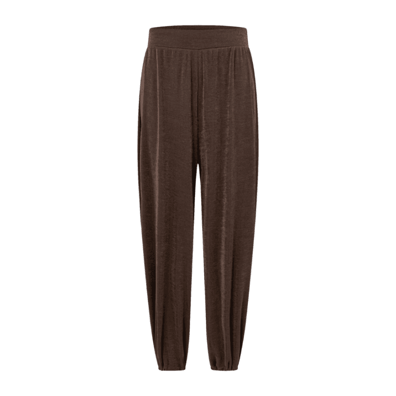 Para um toque mais formal, você pode trocar a calça jogger por uma calça de alfaiataria reta ou pantalona na mesma tonalidade de marrom e optar por uma blusa de seda sem renda, mantendo o blazer e os acessórios.
