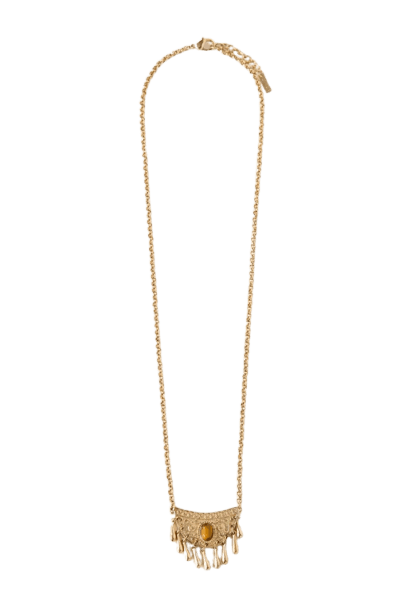 Um colar longo dourado, como o da imagem, complementa perfeitamente. Bolsas estruturadas de tamanho médio e brincos discretos também harmonizam com a proposta elegante e moderna do look, sem sobrecarregar.