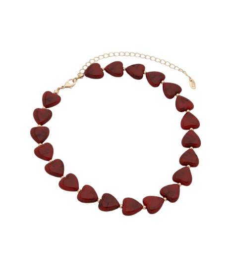 O look já vem com um colar de corações e brincos florais que complementam perfeitamente. Para um toque extra, uma bolsa de mão pequena em tom dourado ou bordô seria uma ótima escolha.