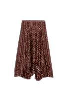 As peças centrais são a camisa oversized em tom rosa claro, a saia midi plissada em bordô e o scarpin slingback bordado. A bolsa de mão com alça dourada e os brincos de argola complementam com elegância.