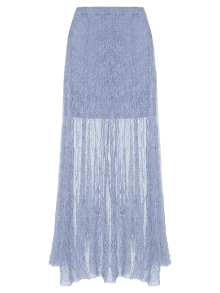 A saia longa azul com sua textura única e caimento fluido adiciona um toque de leveza e modernidade ao look, equilibrando a formalidade da camisa branca e criando um visual interessante e confortável.