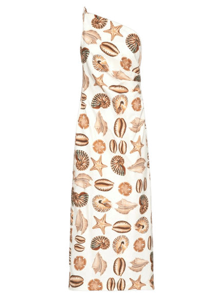 Este look encapsula a essência do verão com uma elegância descontraída. O vestido midi tomara que caia, adornado com uma estampa delicada de conchas e estrelas do mar em tons terrosos, é a peça central. Complementando a vibe praiana chic, a bolsa de palha em tom natural e a sandália prateada de salto baixo oferecem conforto e estilo. Os acessórios dourados, como brincos e pulseira, adicionam um toque de sofisticação, enquanto o cinto fino e o lenço estampado arrematam a produção com charme. Ideal para dias ensolarados, passeios em resorts ou almoços especiais à beira-mar.