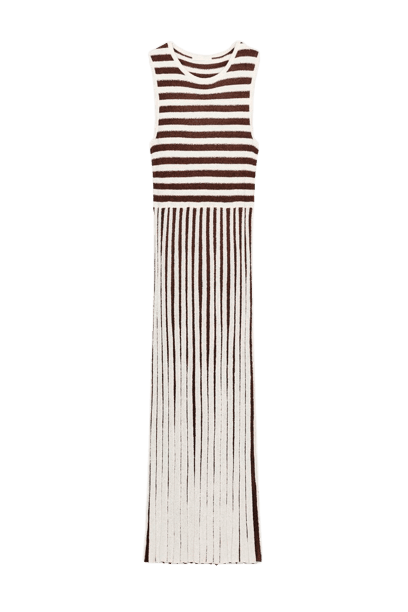 Este look exala uma elegância casual chic, perfeito para a mulher moderna que busca conforto sem abrir mão do estilo. O blazer bege de corte clássico confere sofisticação, enquanto o vestido midi listrado em marrom e off-white, com sua barra de franjas, adiciona um toque contemporâneo e descontraído. A bolsa de mão dourada e as sapatilhas marrons com fivela complementam o conjunto, trazendo praticidade e charme. Os acessórios dourados, como brincos e pulseiras, finalizam a produção com um brilho sutil. Ideal para transitar do escritório a um evento social com facilidade.