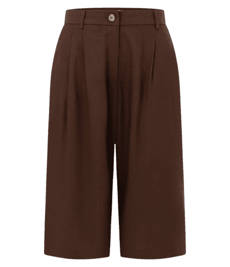 A calça culotte marrom é super versátil! Para um look casual, combine com t-shirts e tênis. Para um toque mais elegante, como neste look, use com blusas de seda, camisas ou um blazer, e finalize com mules ou scarpins.