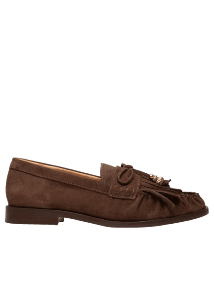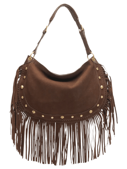 Os destaques são a combinação do conforto do vestido midi canelado com a personalidade da jaqueta estampada. A bolsa com franjas e o mocassim de camurça adicionam um toque boho e sofisticado.