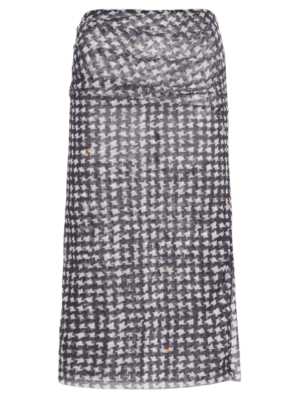A saia midi xadrez combina perfeitamente com acessórios em tons neutros como preto e dourado, como o cinto e a bolsa transversal. Brincos dourados adicionam um toque de sofisticação.