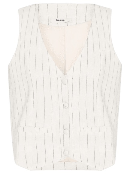 Este look exala sofisticação e modernidade, ideal para a mulher que busca elegância no ambiente de trabalho. Composto por um blazer e colete listrados em tons claros, que trazem um toque de leveza e profissionalismo, e uma calça pantalona marinho de corte impecável, ele equilibra o clássico com o contemporâneo. Os acessórios dourados, como brincos e colar, adicionam um brilho sutil, enquanto a bolsa matelassê branca e a sandália slingback preta de salto baixo completam a produção com um toque de refinamento e conforto. Perfeito para reuniões, eventos corporativos ou um dia produtivo no escritório.