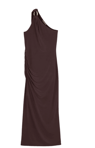 Este look exala sofisticação e elegância, ideal para eventos noturnos ou ocasiões especiais. O vestido midi de um ombro só em um tom de marrom chocolate é a peça central, com seu caimento fluido e detalhe drapeado que valoriza a silhueta. A sandália de salto bloco dourada adiciona um toque de glamour e conforto, enquanto a bolsa de ombro matelassê preta com detalhes dourados complementa o conjunto com um ar clássico e chique. Os óculos de sol com armação tartaruga finalizam o visual, conferindo um toque de mistério e estilo. Uma combinação perfeita para quem busca um visual impactante e refinado.