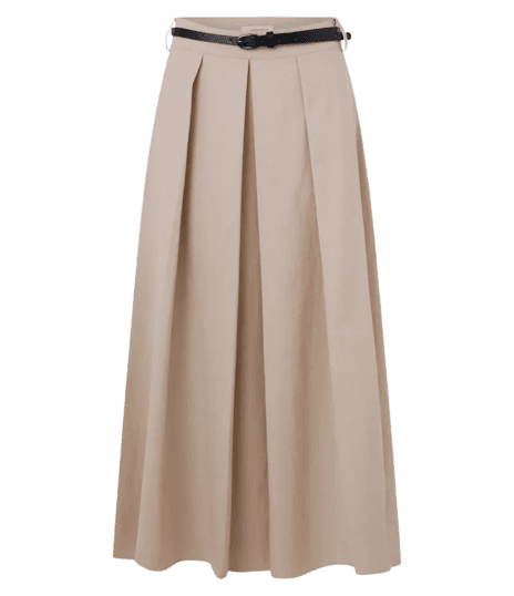 Este look exala uma elegância discreta e moderna, combinando peças clássicas com um toque contemporâneo. A saia midi plissada em tom bege neutro oferece movimento e sofisticação, enquanto a blusa de gola alta branca adiciona um ar refinado e minimalista. Os acessórios dourados, como os brincos e o colar, trazem um brilho sutil, complementados pela bolsa de mão preta com alça metálica e os scarpins slingback brancos. É a escolha perfeita para a mulher que busca versatilidade e estilo, transitando com facilidade do ambiente profissional a eventos sociais, do dia à noite.
