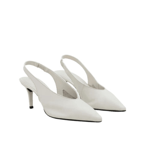 Scarpins slingback como os do look são perfeitos. Sapatilhas de bico fino, mules ou sandálias de salto bloco também podem complementar o visual, dependendo da formalidade e do conforto desejados.