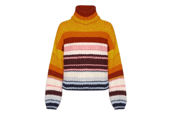 Este look de outono/inverno exala conforto e sofisticação, perfeito para quem busca um visual elegante sem abrir mão do bem-estar. O suéter de gola alta com listras vibrantes em tons terrosos e pastel é a peça central, trazendo um toque de cor e alegria. A saia midi vinho, com seu caimento fluido e detalhe torcido na cintura, adiciona um toque de feminilidade e modernidade. Complementando o conjunto, o scarpin slingback marrom com laço e a bolsa de ombro estruturada no mesmo tom conferem um ar clássico e refinado. Os brincos dourados finalizam com um brilho sutil, ideal para diversas ocasiões, do trabalho ao happy hour.