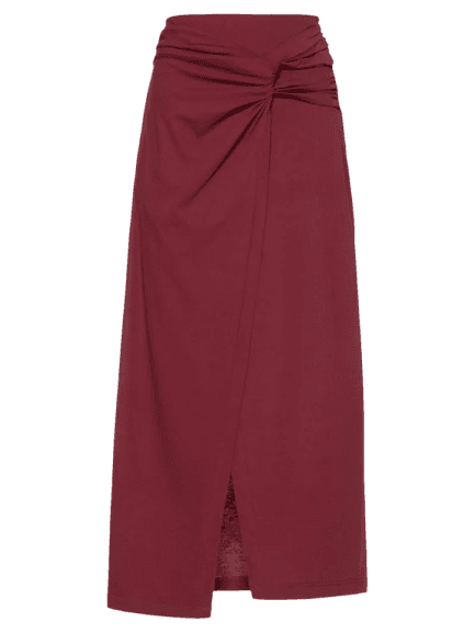 Para um toque mais formal, você pode trocar o suéter por uma blusa de seda em tom neutro e adicionar um blazer estruturado. Mantenha a saia midi e os acessórios para um visual sofisticado e adequado.