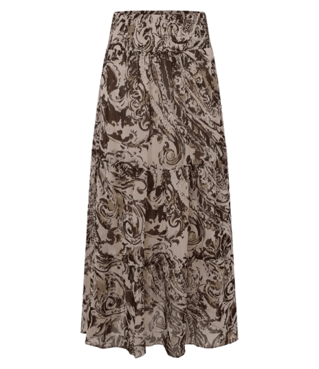As cores principais são marrom e bege/creme, criando uma paleta de tons terrosos. O marrom do blazer e da sapatilha traz sofisticação, enquanto o bege do colete e da estampa da saia adiciona leveza e equilíbrio, resultando em uma combinação harmoniosa e elegante.