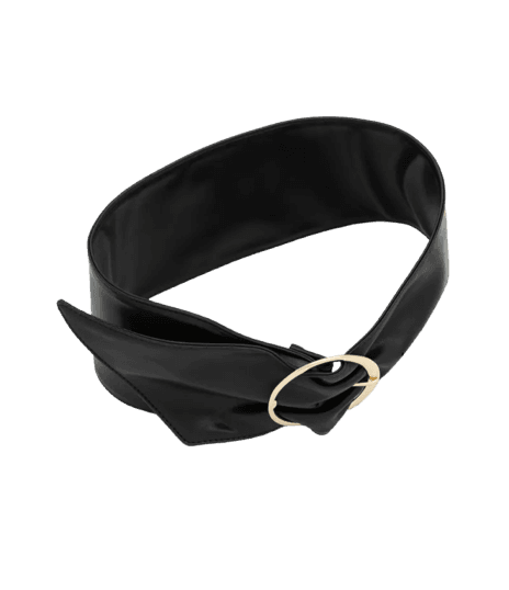 Os acessórios pretos e dourados, como a bolsa de mão com alça metálica, o cinto largo e os brincos statement, complementam perfeitamente o look, adicionando um toque de sofisticação e modernidade. Você pode variar com colares ou pulseiras discretas.