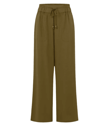O verde oliva e o bege são cores neutras e versáteis. Elas combinam harmoniosamente com tons terrosos como marrom e caramelo, além de dourado nos acessórios, como visto no look. Para um contraste, o azul marinho ou branco também seriam ótimas opções.