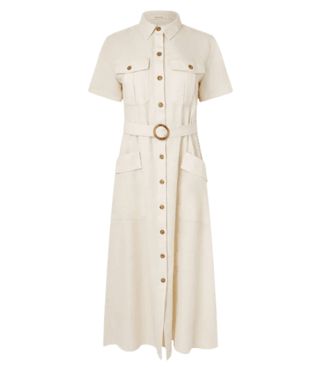 Acessórios em tons dourados, como brincos de argola e colares de elos, complementam perfeitamente o vestido chemise creme. Bolsas em tons neutros como bege, off-white ou até mesmo em palha, e calçados em tons terrosos ou metálicos, como sapatilhas ou sandálias, são ótimas escolhas.