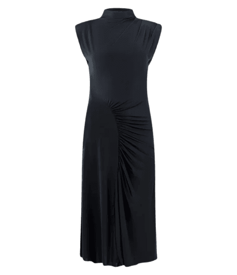 Desvende a elegância atemporal com este look que celebra a versatilidade do vestido midi preto. Com gola alta e um drapeado lateral sutil, a peça principal exala sofisticação. Acompanhando, uma sandália de salto bloco preta oferece conforto e estilo. A bolsa tote em tons de marrom e bege adiciona um toque terroso, enquanto os óculos de sol complementam o charme. Os acessórios dourados – colar longo, gargantilha, relógio e brincos – elevam o visual, tornando-o ideal para transitar com facilidade do ambiente de trabalho a um jantar especial ou evento social.