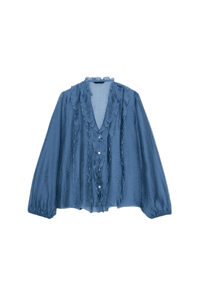 Deslumbre-se com este look boho chic que exala conforto e personalidade. A blusa azul acinzentado com delicados babados e gola franzida oferece um toque romântico e fluido, combinando perfeitamente com a calça pantalona de estampa paisley em tons de azul marinho e claro. Para completar, a bolsa a tiracolo de camurça caramelo com franjas e detalhes bordados adiciona um charme artesanal, enquanto as sapatilhas slingback de bico fino garantem elegância e praticidade. Ideal para quem busca um visual autêntico e estiloso para diversas ocasiões, do dia à noite.