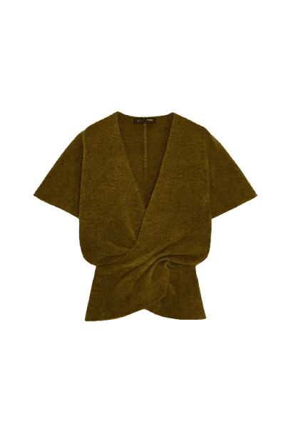 Este look exala sofisticação e versatilidade, perfeito para a mulher moderna que busca elegância sem abrir mão do conforto. A blusa transpassada em tom verde oliva oferece um caimento impecável, combinando harmoniosamente com a calça pantalona marrom, que alonga a silhueta. Os acessórios dourados, como o scarpin de bico fino, o bracelete e o colar minimalista, adicionam um toque de glamour. A bolsa estruturada em borgonha finaliza a composição com um ponto de cor refinado, tornando-o ideal para o trabalho, eventos sociais ou um jantar especial.