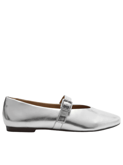 Acessórios prateados, como brincos de coração e uma bolsa matelassê, elevam o visual. Sapatilhas Mary Jane metálicas também são uma ótima pedida para um toque fashion e confortável.