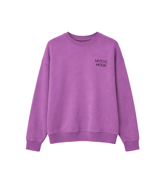 Este look combina o conforto despojado do moletom roxo com a elegância casual da calça jeans de lavagem escura e corte reto. A peça superior, com a estampa 'MYSTIC MOON', adiciona um toque místico e moderno. As botas pretas de salto fino e bico pontudo alongam a silhueta, enquanto a bolsa verde oliva com detalhes em metalizado prateado e os brincos geométricos complementam o visual com sofisticação e um toque de cor inesperado. Perfeito para quem busca um estilo urbano e confortável sem abrir mão da personalidade, ideal para compromissos diurnos, um happy hour descontraído ou um passeio no fim de semana.