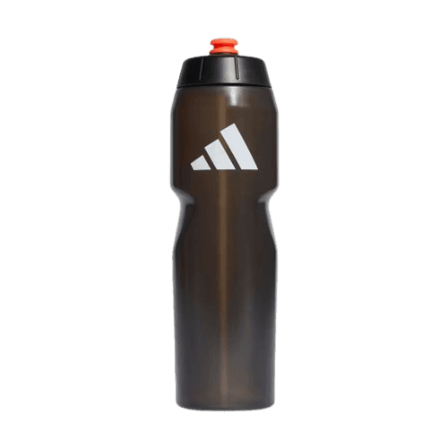 O look é composto por um boné preto, uma camiseta esportiva com logo, um shorts de treino com listras, um par de tênis casuais e uma garrafa de água, todos da marca Adidas.