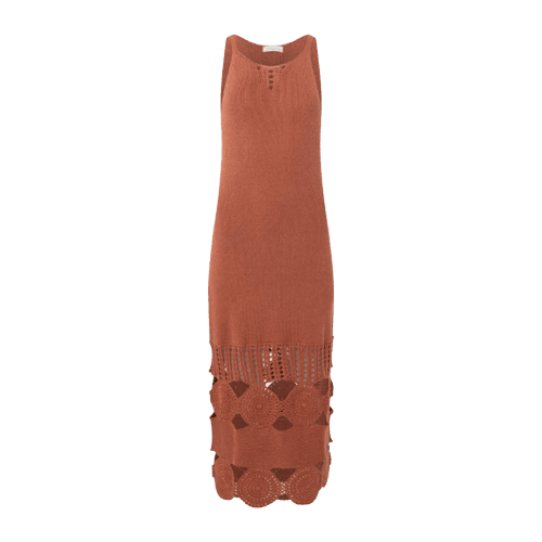 O vestido midi em tom terracota, com sua textura e detalhes vazados na barra, oferece conforto e um toque artesanal, sendo a peça central que equilibra a casualidade da jaqueta jeans e adiciona feminilidade.