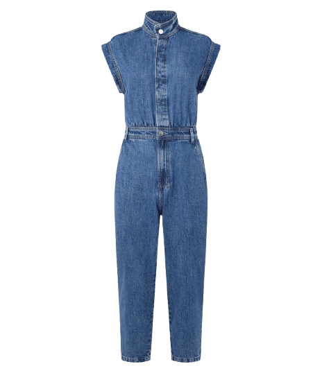 As peças-chave são o macacão jeans, que oferece praticidade e estilo, a regata listrada que adiciona um toque de cor e textura, e os acessórios que elevam o visual, como a bolsa e os brincos de pérola.