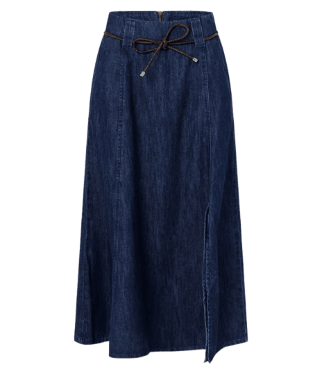 Este look exala um charme casual chic, perfeito para a mulher moderna que busca versatilidade e estilo. A combinação do body azul acinzentado com a saia midi jeans de lavagem escura cria uma base elegante e confortável. O blazer alongado bordô adiciona um toque de cor sofisticado e estrutura ao visual, ideal para transitar entre compromissos de trabalho e momentos de lazer. As botas de cano curto marrom caramelo e os brincos de argola em madeira e dourado complementam o conjunto, trazendo um ar contemporâneo e aconchegante. Uma escolha impecável para o dia a dia, happy hour ou um evento cultural.