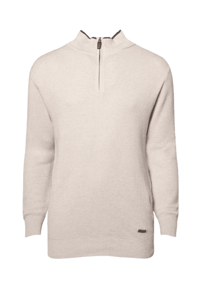 Para dias mais amenos, você pode remover a jaqueta puffer e usar apenas o suéter com o jeans. O suéter de meio zíper permite ajustar a ventilação, tornando-o versátil.